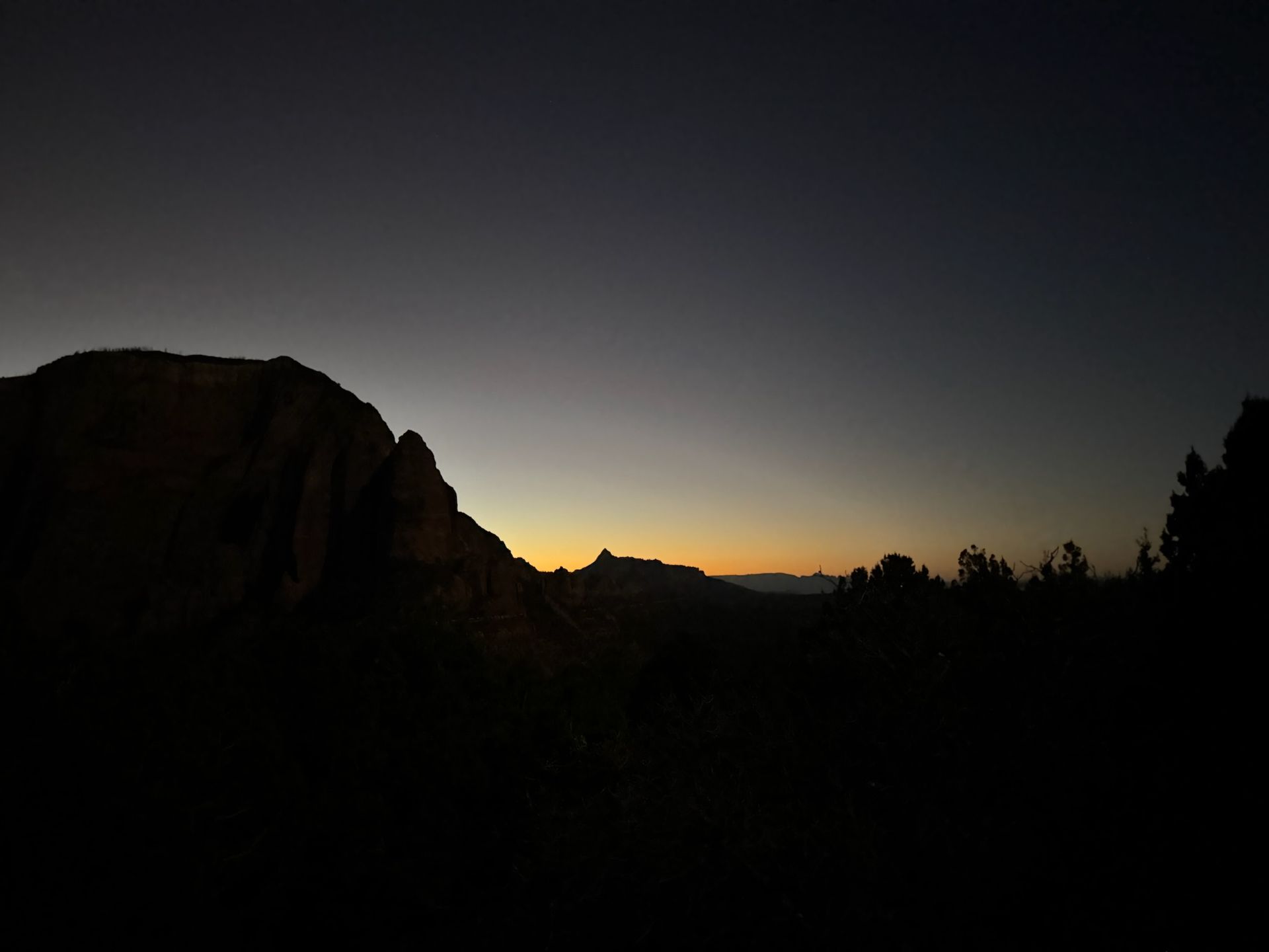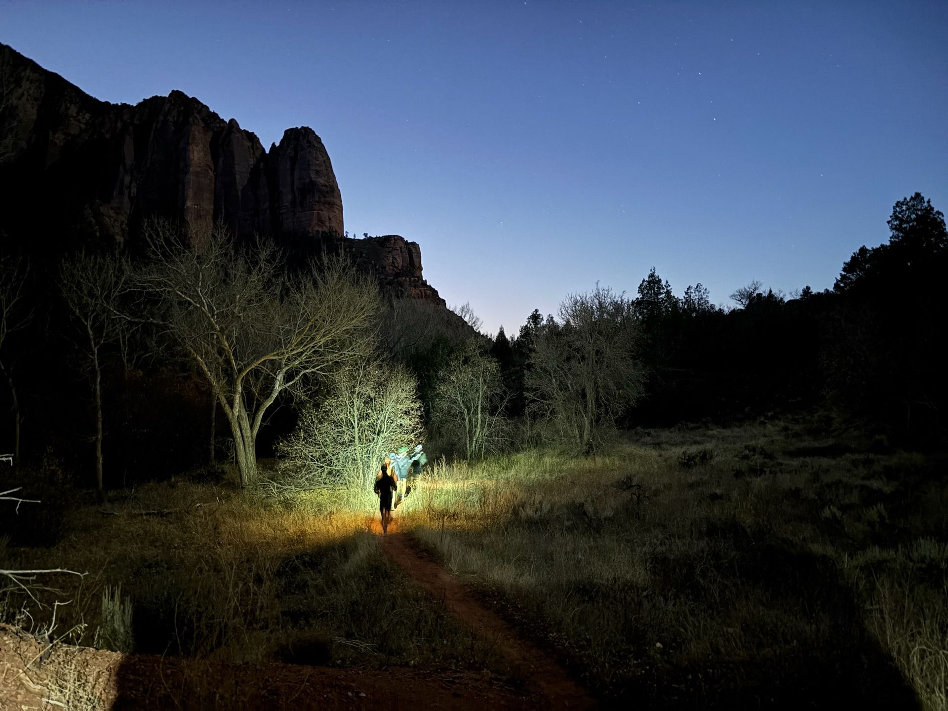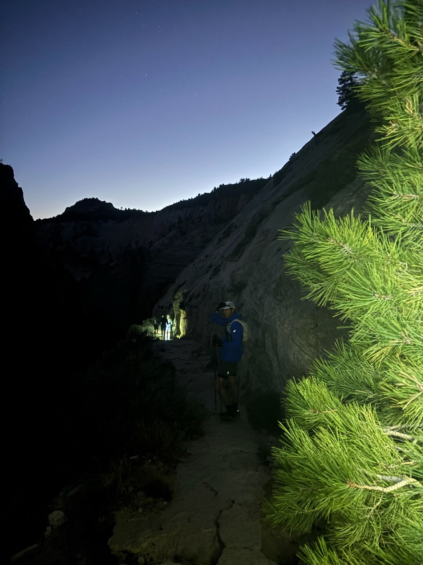 As the sun set, we reached the final descent. That’s when the switch flipped. My stomach revolted once again. Nausea returned. Dehydration set in. My lightheadedness increased as daylight disappeared, and our team descended into the darkness of Zion Canyon guided only by our headlamps.